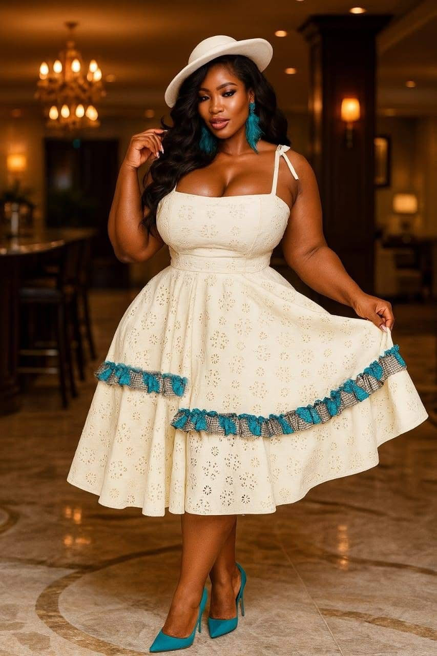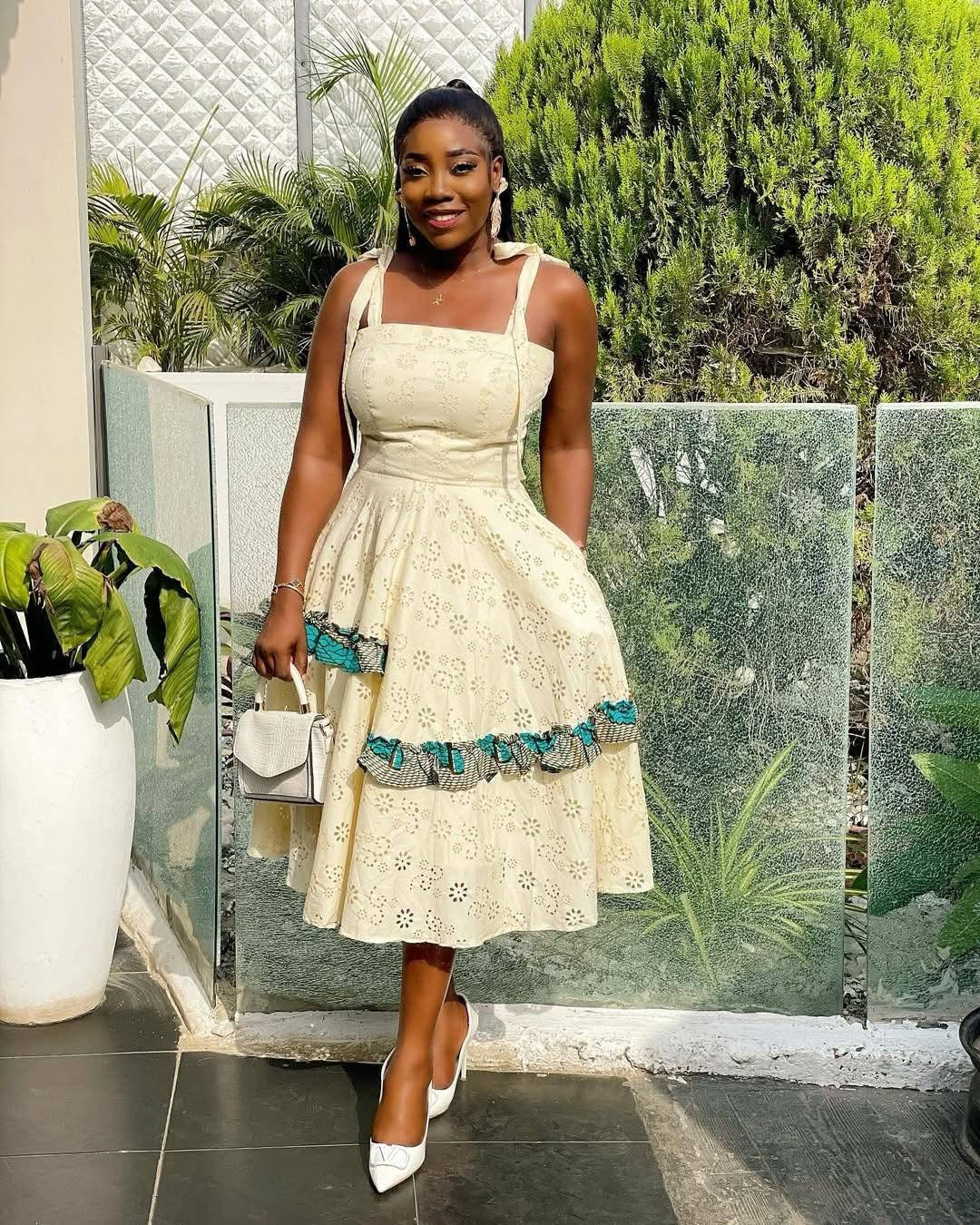 This sophisticated cream-colored dress combines classic eyelet embroidery with vibrant African-inspired trim details, creating a perfect fusion of timeless elegance and cultural flair. The flattering midi length and structured bodice create a silhouette that celebrates every curve.