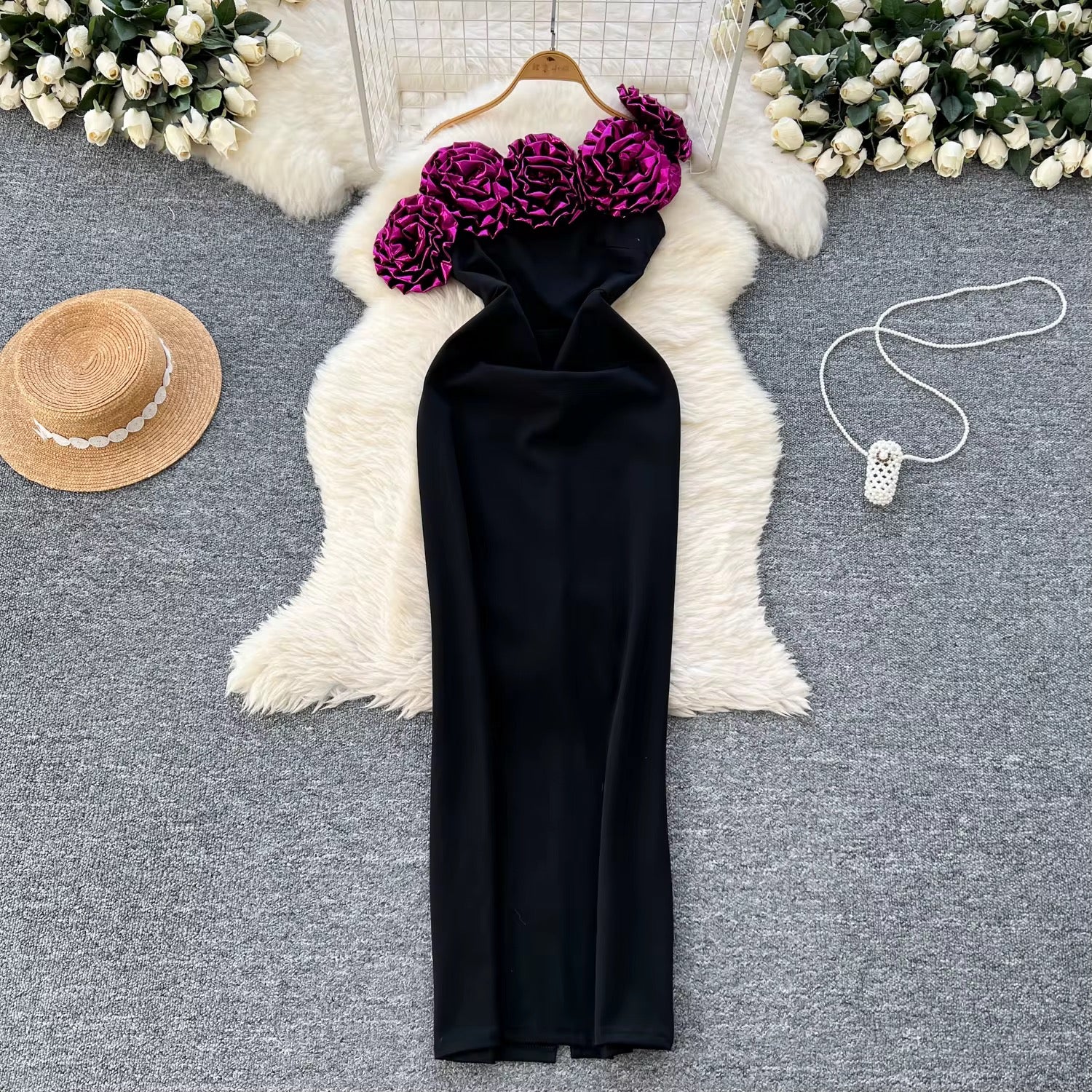 Turn heads with this breathtaking one shoulder black bodycon maxi dress featuring an exquisite 3D flower design that gracefully flows from the underarm to over the shoulder. This statement piece combines dramatic asymmetrical styling with luxurious floral embellishments for an unforgettable look.