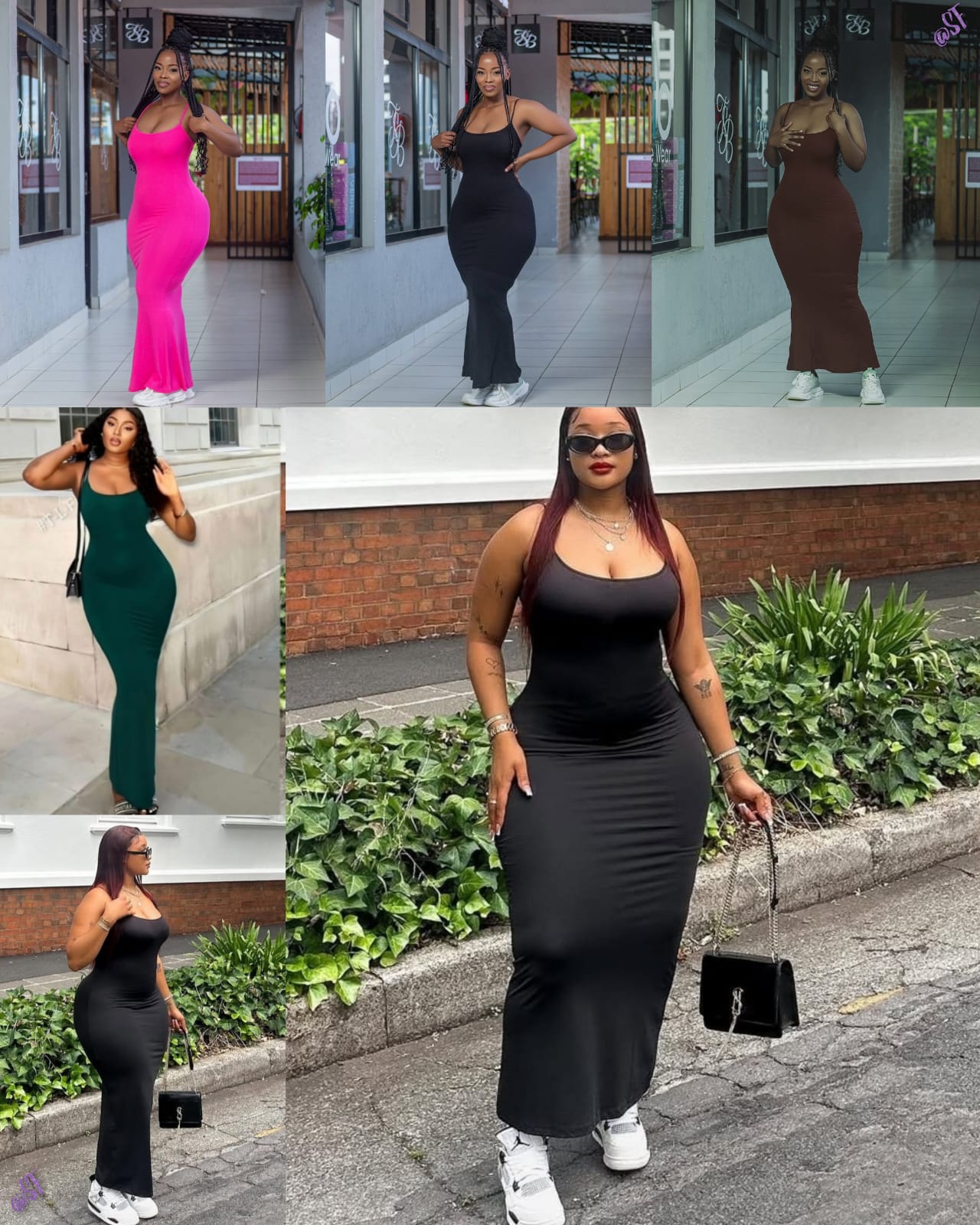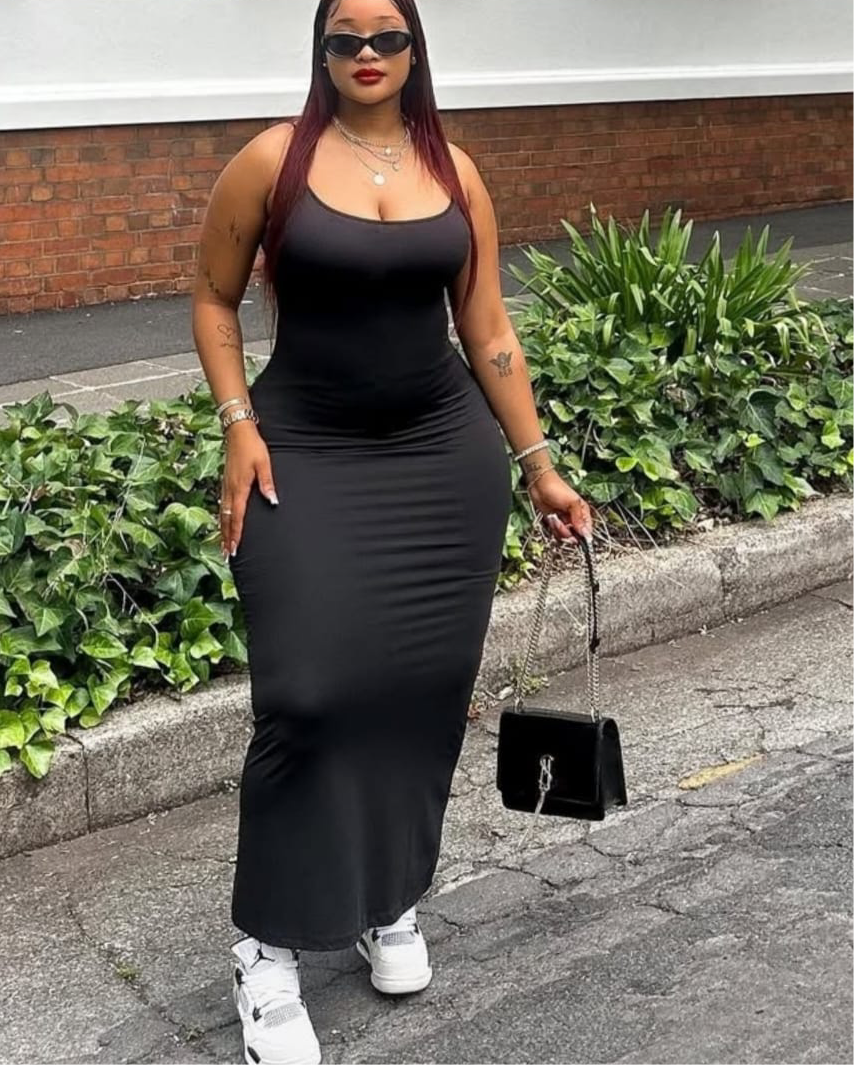 Elevate your wardrobe with this stunning sleeveless bodycon maxi dress that hugs your curves in all the right places. This figure-flattering dress features a classic scoop neckline and a form-fitting silhouette that flows into a floor-length design.