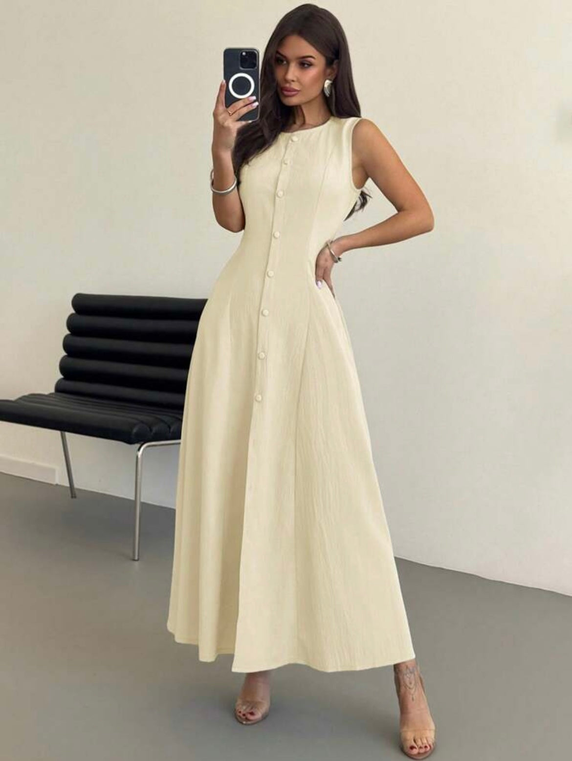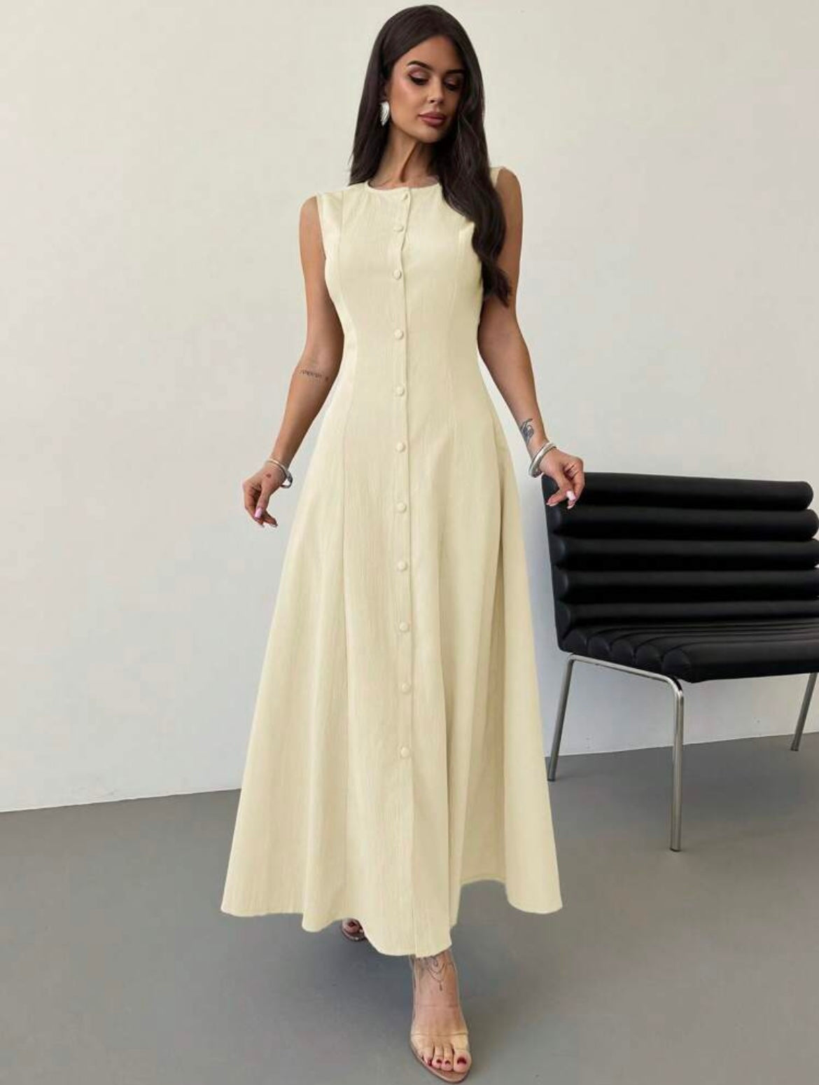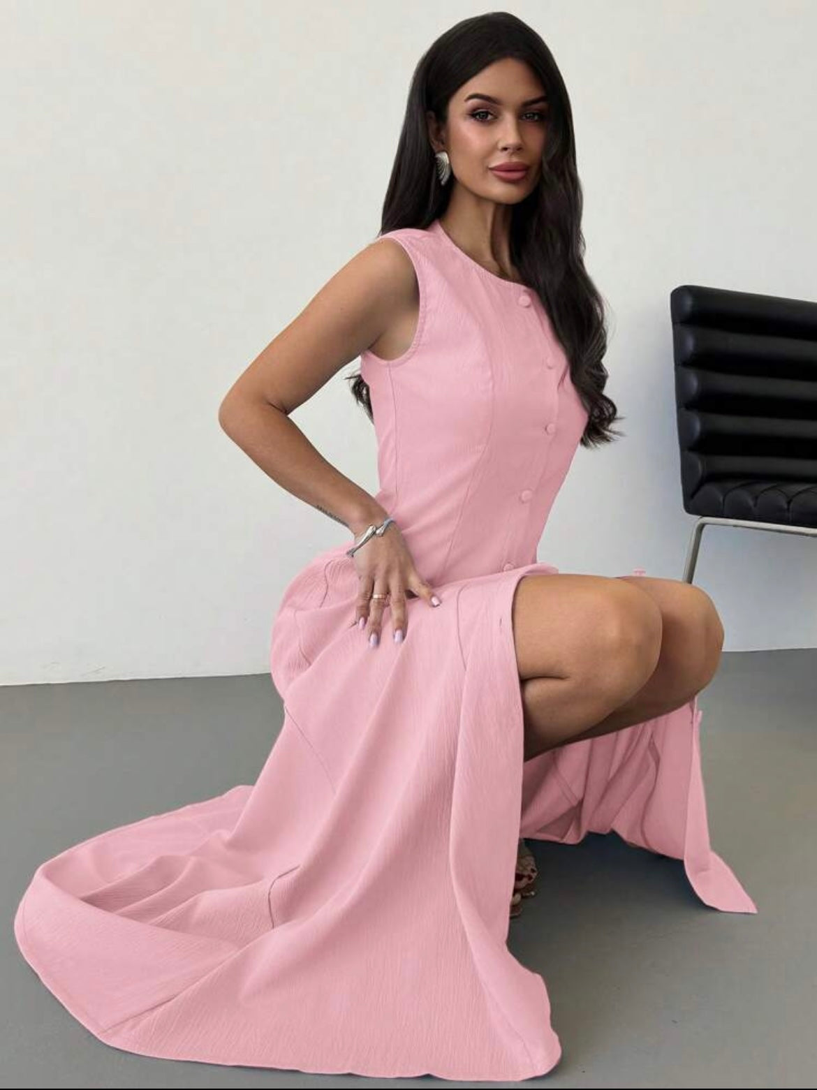 Step into elegance with this stunning sleeveless maxi dress that effortlessly combines comfort with sophisticated style. The flowing silhouette and button-front design create a timeless look that's perfect for any occasion.
