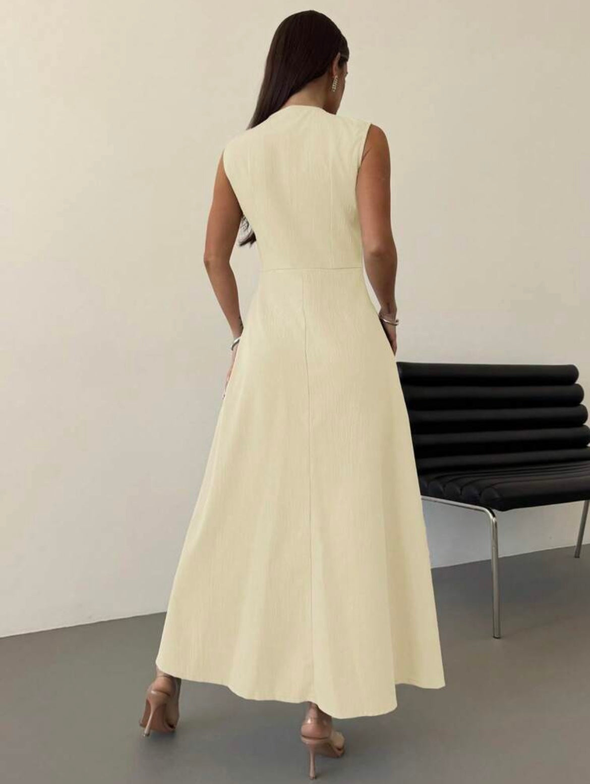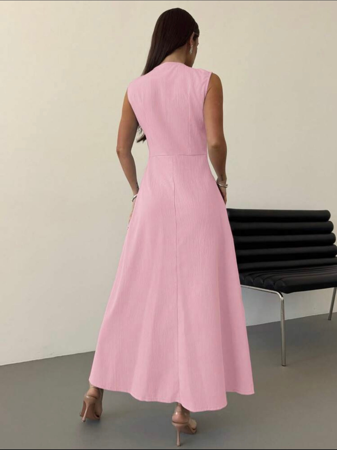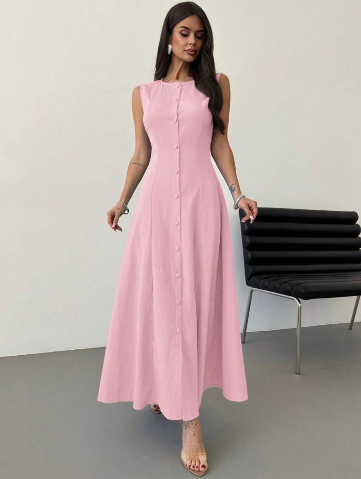 Step into elegance with this stunning sleeveless maxi dress that effortlessly combines comfort with sophisticated style. The flowing silhouette and button-front design create a timeless look that's perfect for any occasion.