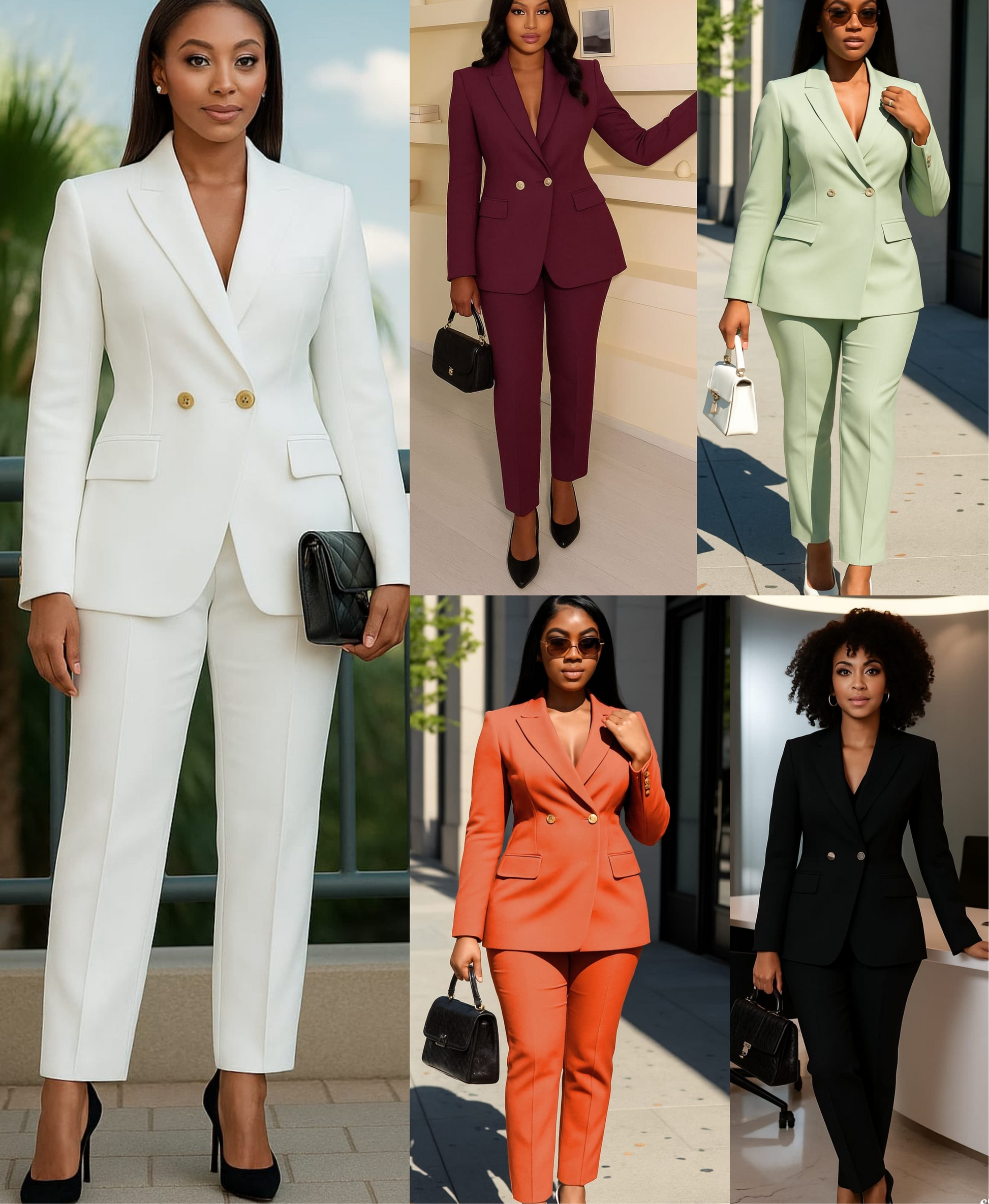 Elevate your professional wardrobe with this sophisticated double-breasted business suit set. Crafted for the modern woman who demands both style and confidence in the workplace.